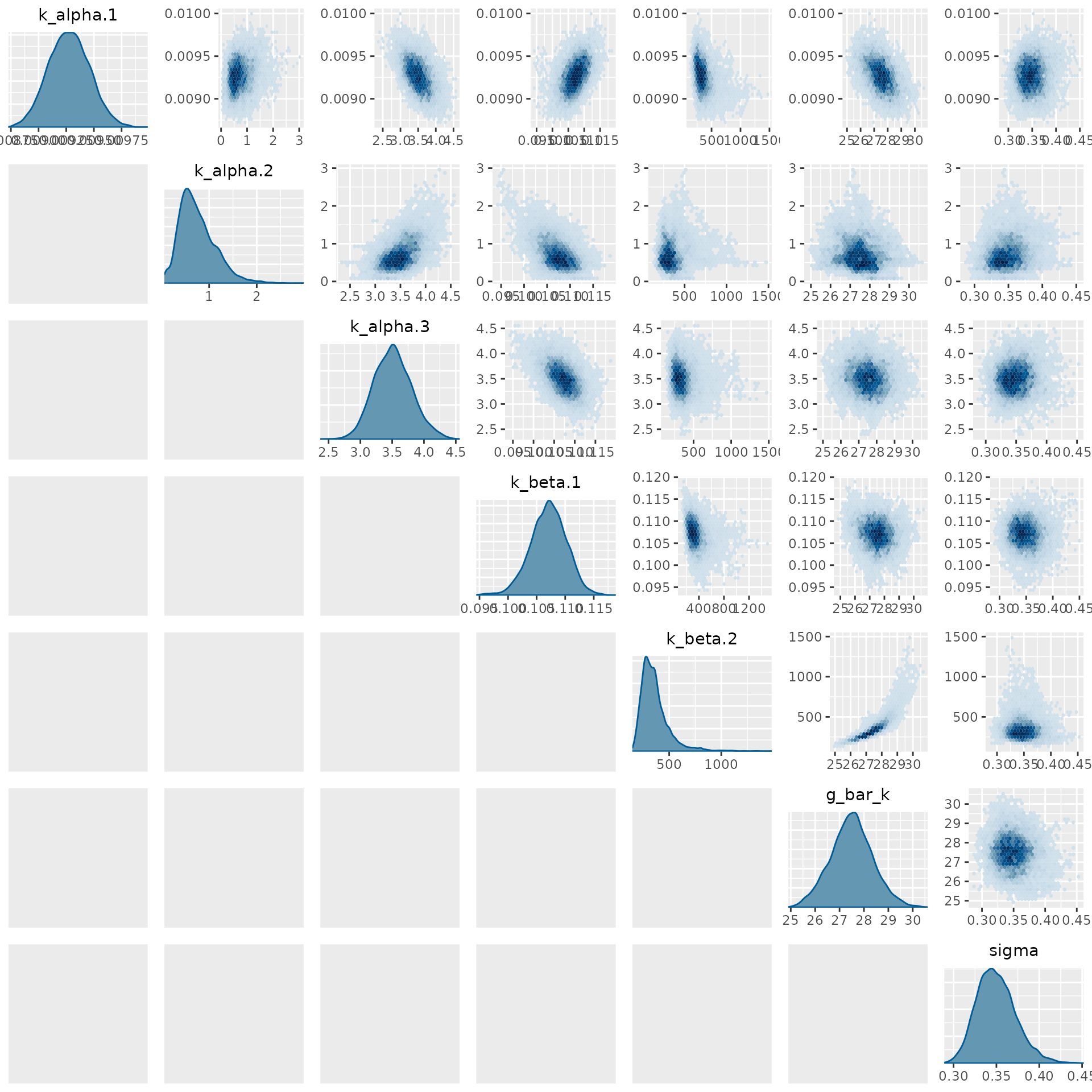 #> rhatFor example, we can plot a pair plot of the univariate and bivariate marginal posterior distributions on the parameters as follows: