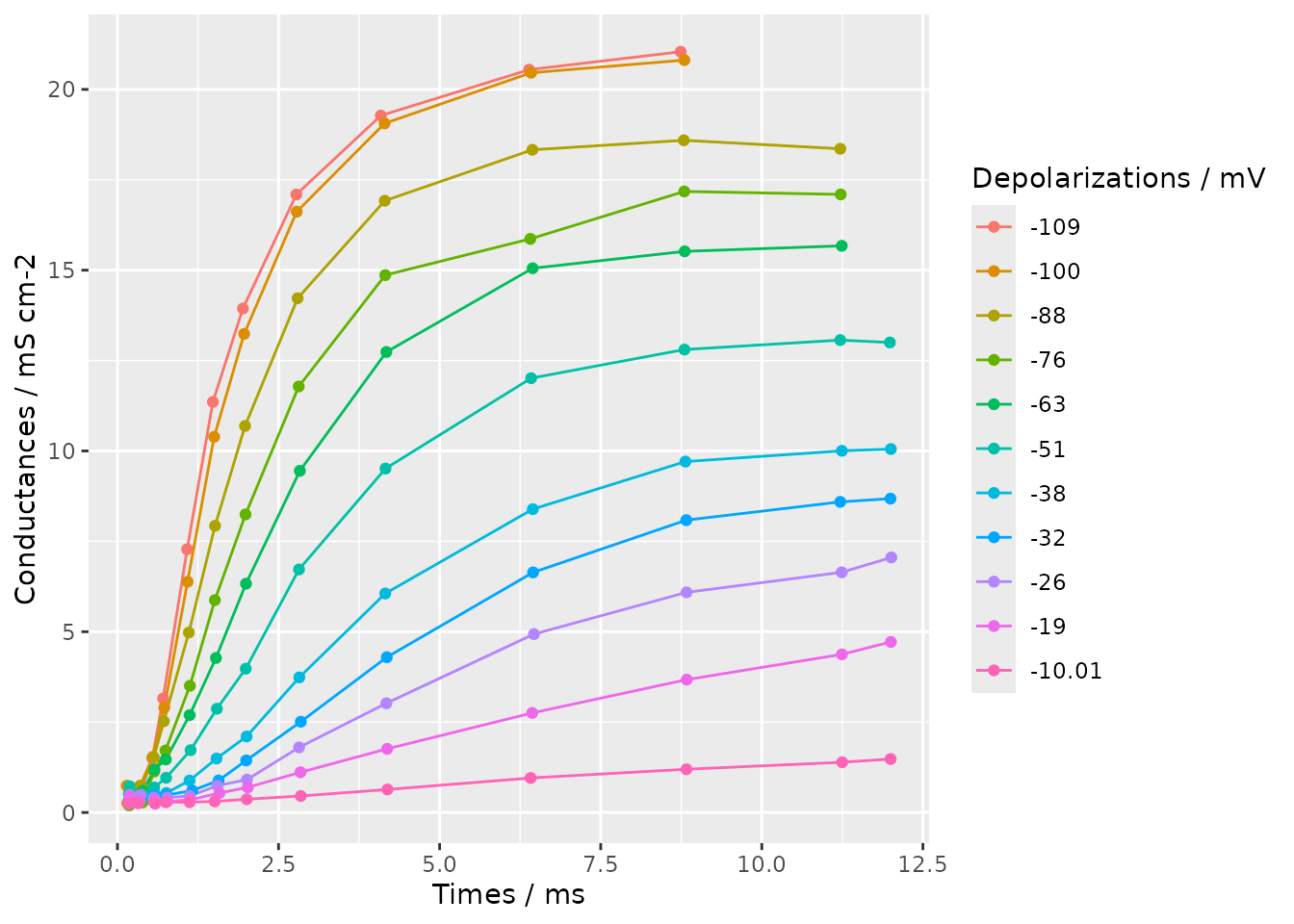 where and are the pairs of measurement times and applied depolarization voltages for the measured potassium conductance .